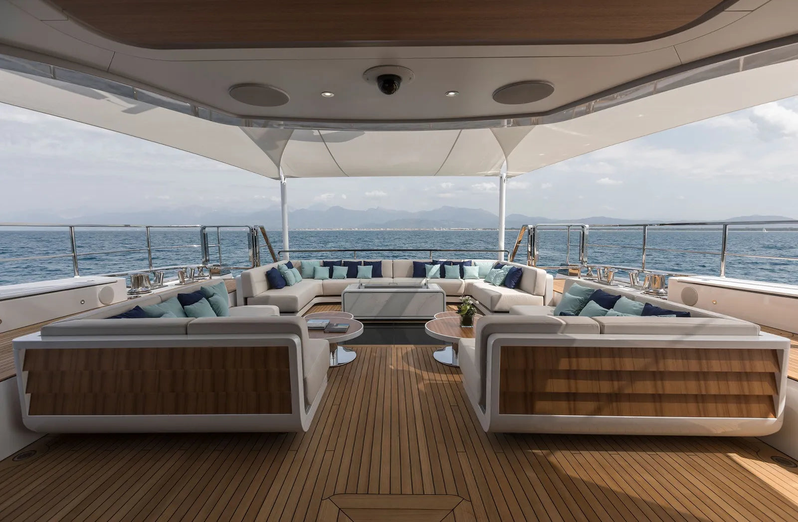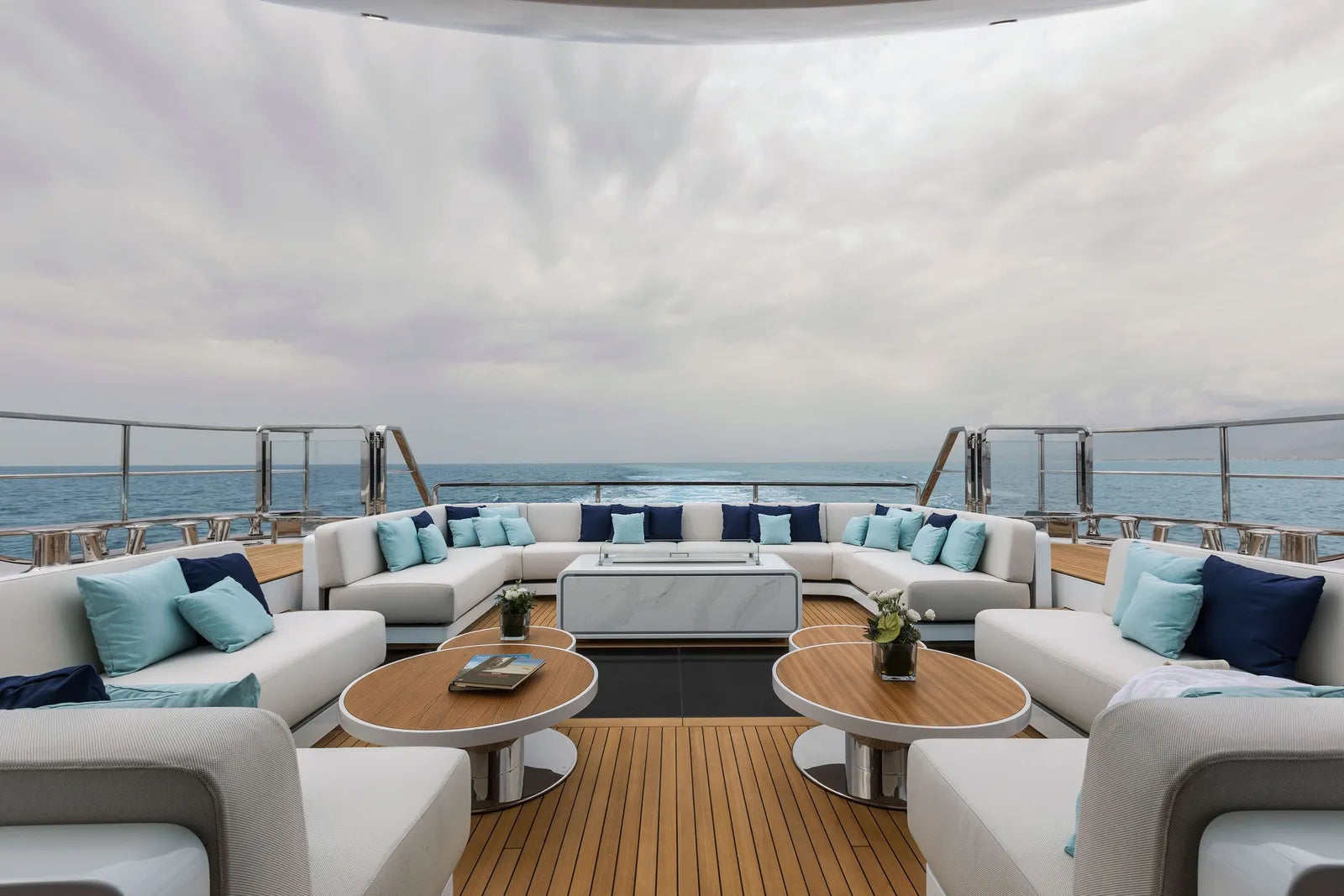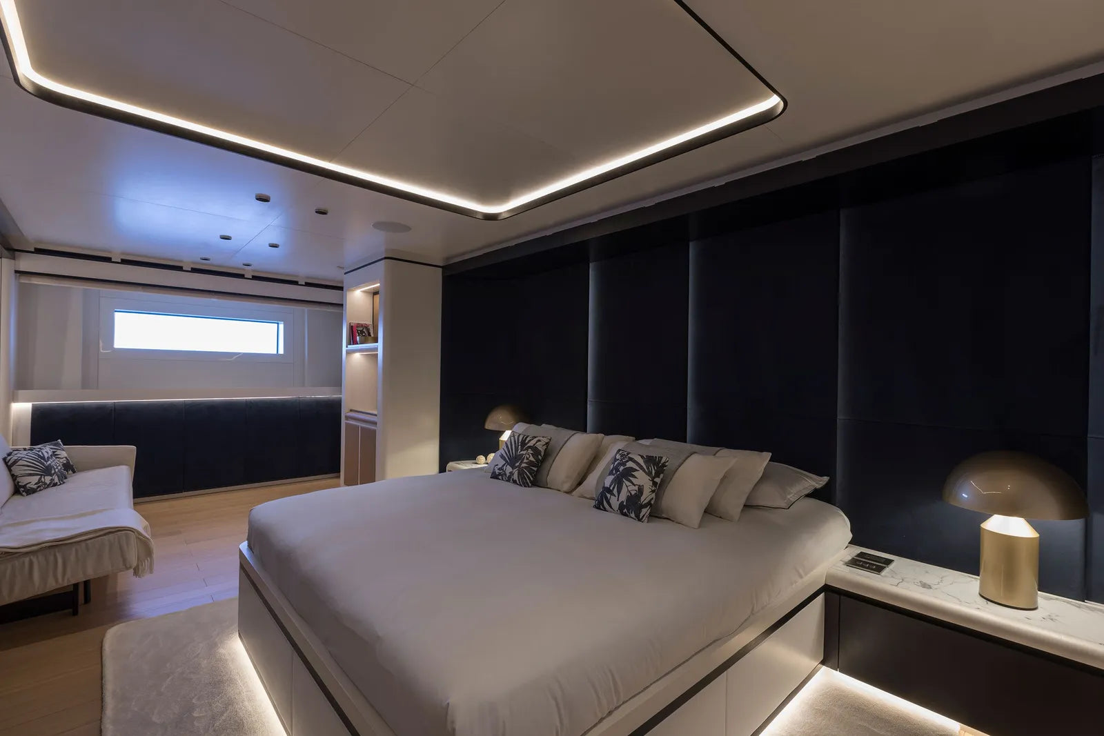 Perfect for family adventures or romantic escapes, MAVERICK accommodates up to 12 guests in six beautifully appointed cabins. The main deck owner’s suite features a private balcony, walk-in closet, and electric fireplace, while the full-beam VIP suite—with its private entrance—offers an exclusive retreat ideal for couples seeking added privacy. Additional guest cabins, each inspired by iconic destinations like St. Barths and Mykonos, bring personality and charm to every stay.