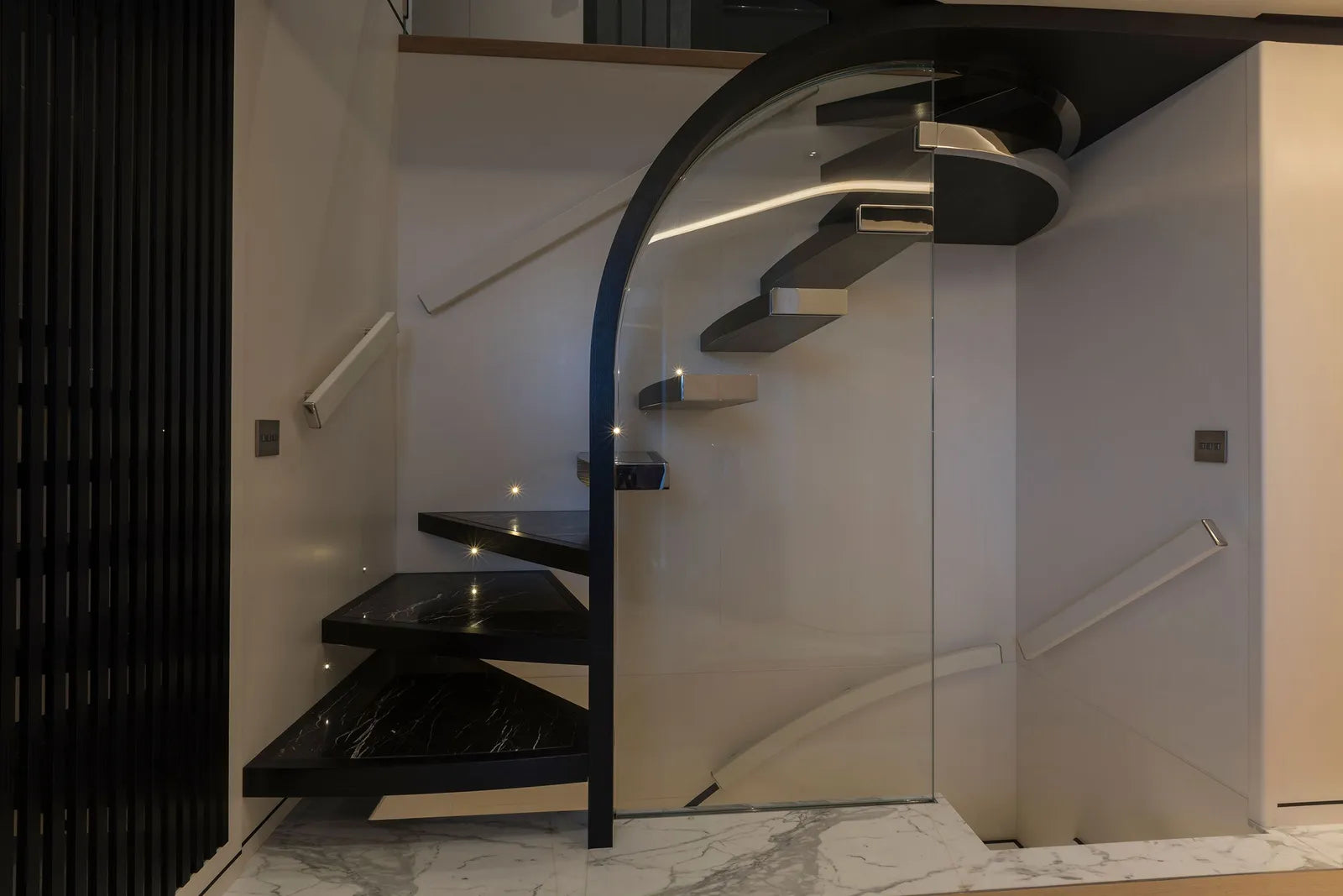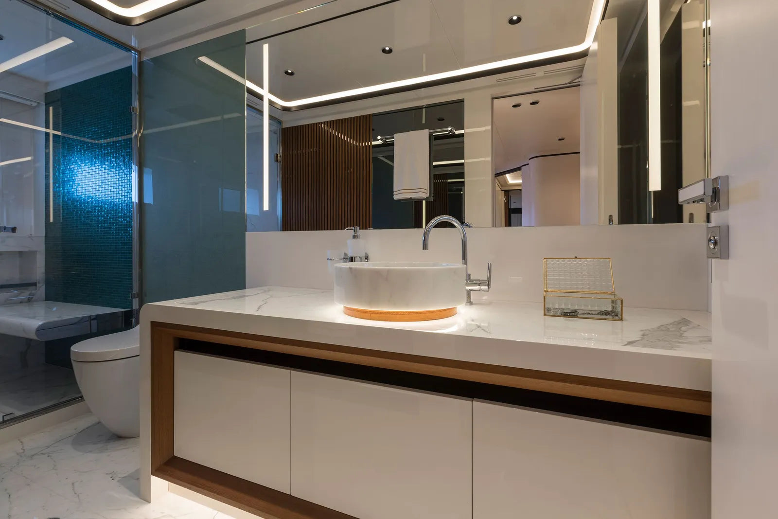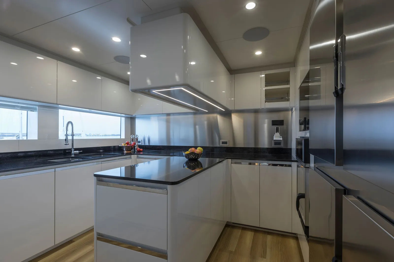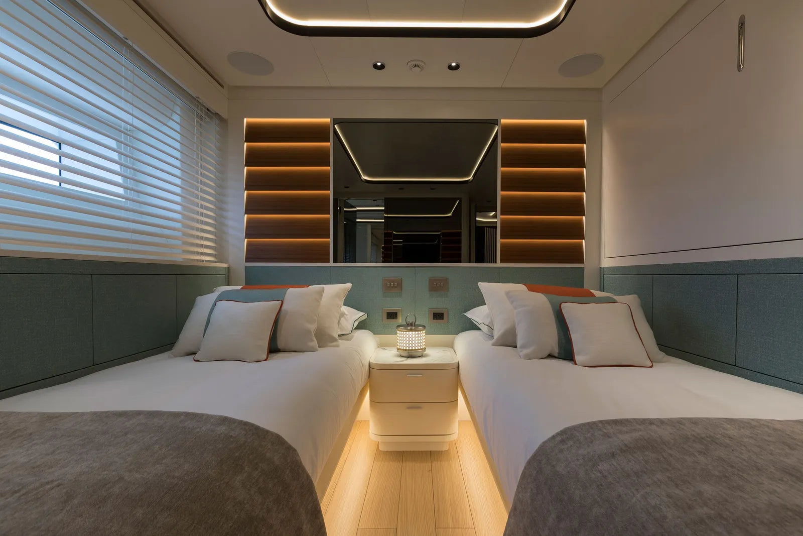 Perfect for family adventures or romantic escapes, MAVERICK accommodates up to 12 guests in six beautifully appointed cabins. The main deck owner’s suite features a private balcony, walk-in closet, and electric fireplace, while the full-beam VIP suite—with its private entrance—offers an exclusive retreat ideal for couples seeking added privacy. Additional guest cabins, each inspired by iconic destinations like St. Barths and Mykonos, bring personality and charm to every stay.