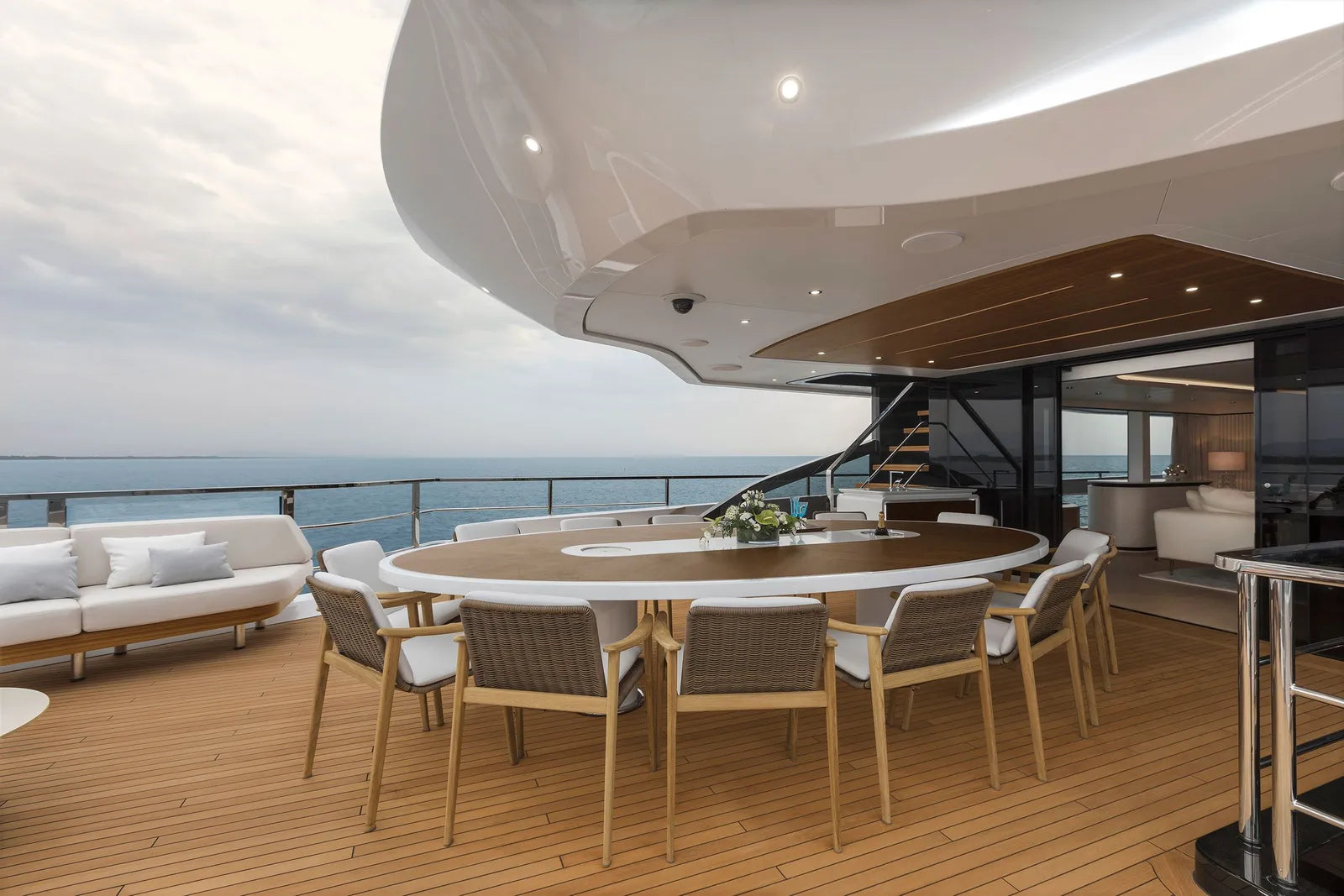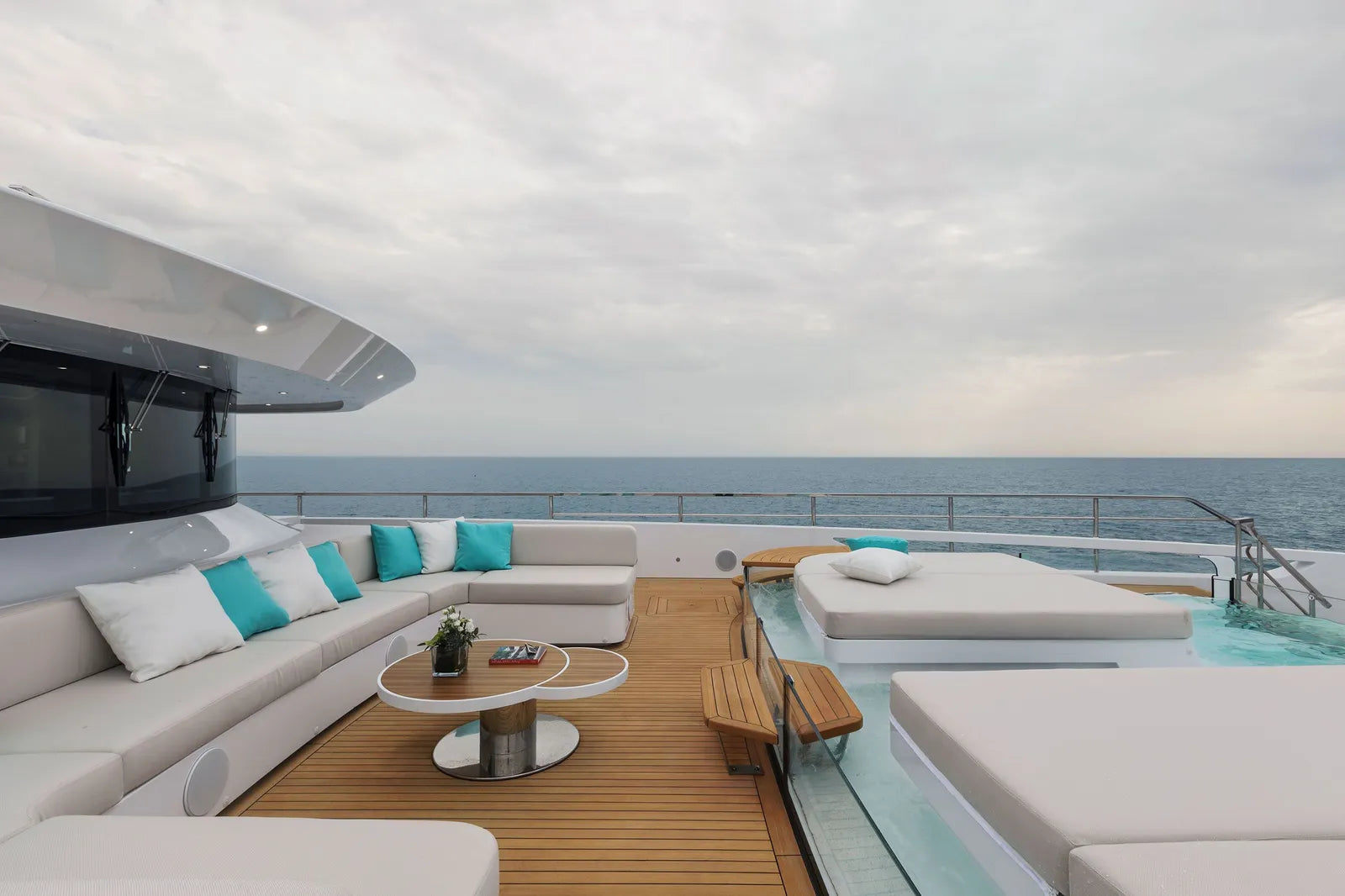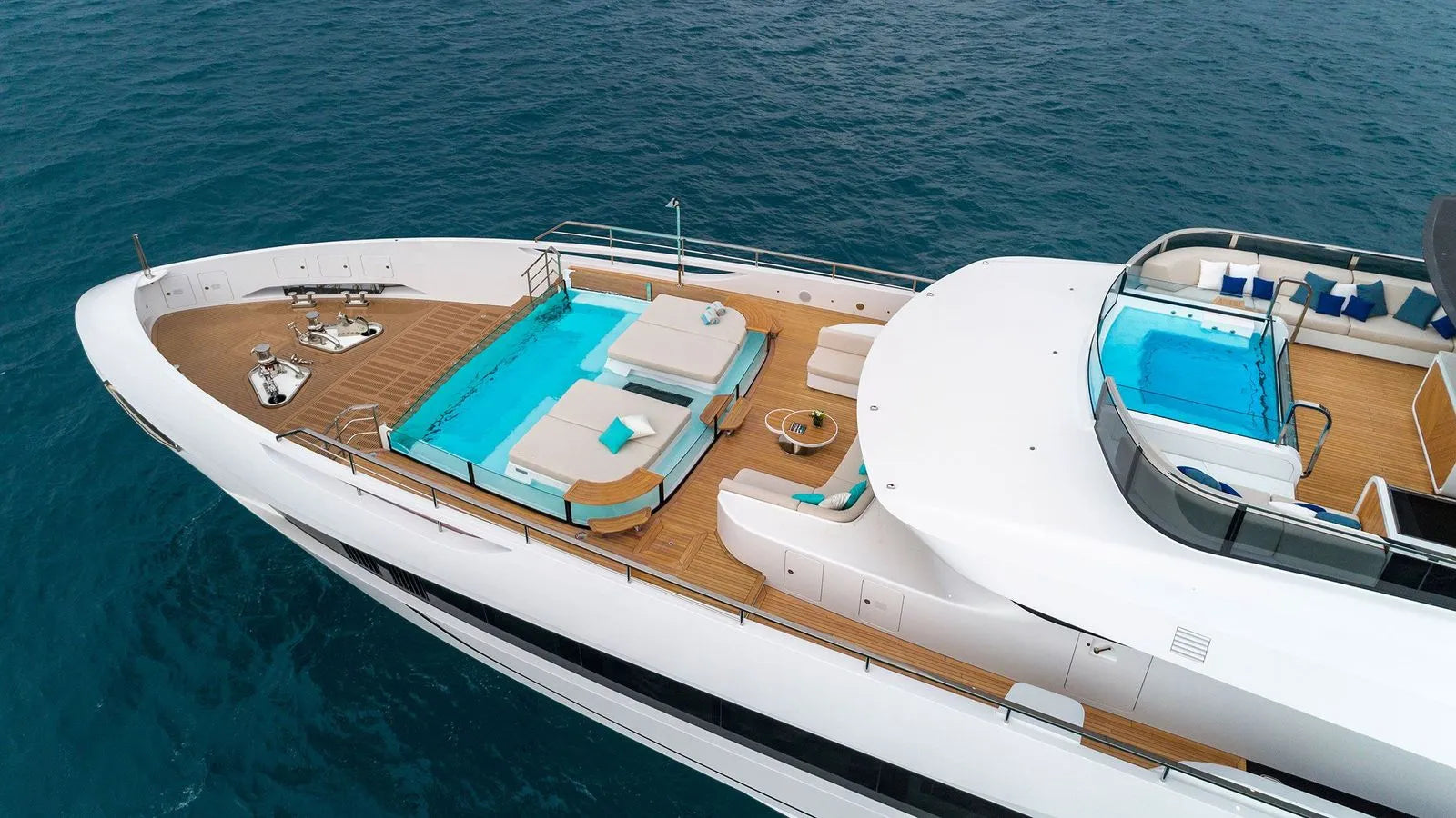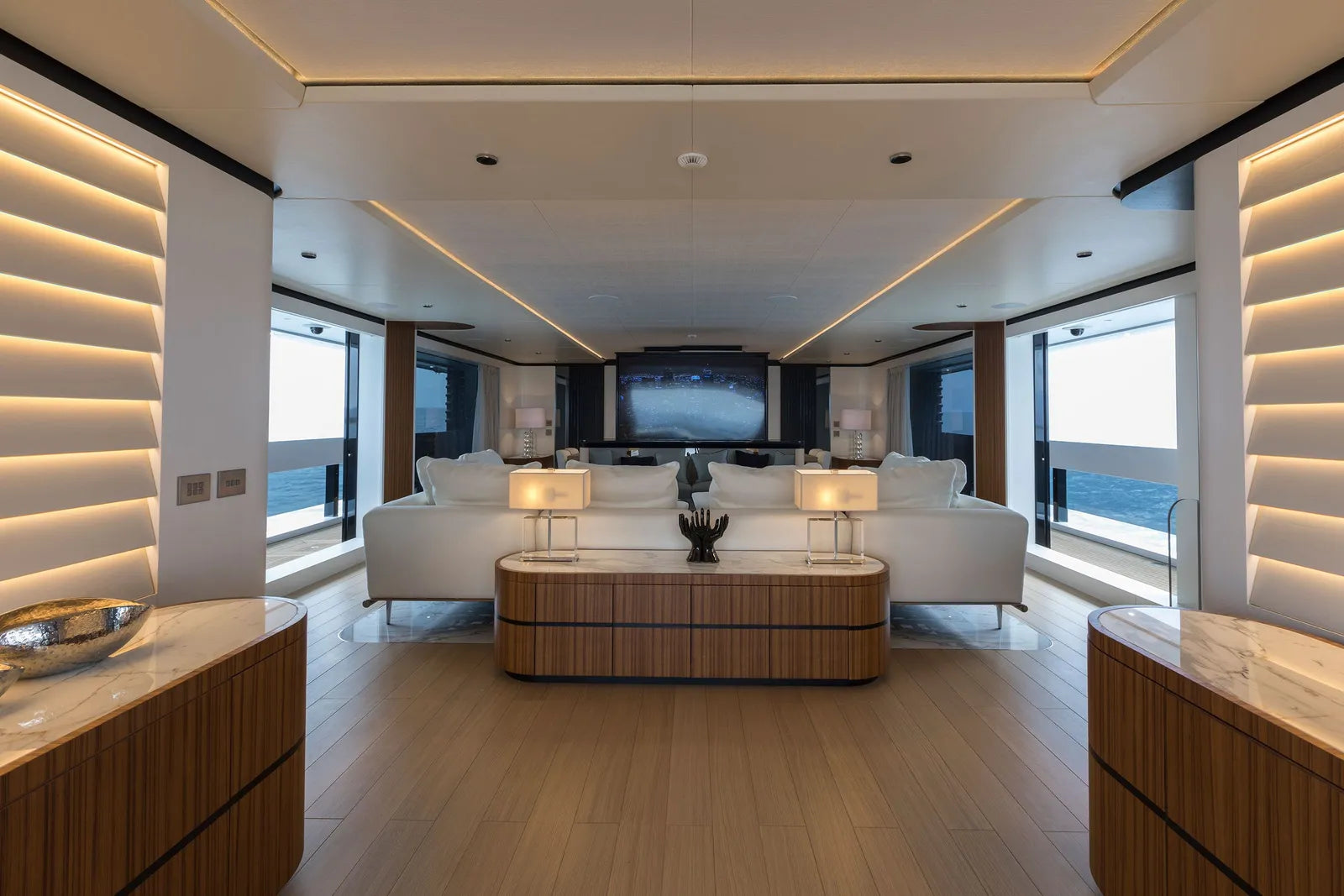 Outdoor living aboard MAVERICK is truly exceptional. Guests can unwind in not just one but two heated pools, including a serene bow infinity pool and a chic sun deck Jacuzzi. Evenings can be spent gathered around the aft firepit or enjoying al fresco dining curated by the yacht’s private chef. The expansive beach club opens on three sides, creating a seamless connection to the sea—perfect for swimming, sunbathing, or launching water toys. Equipped with Zero Speed Stabilizers, a towed tender, and a seasoned crew of 11 delivering five-star service, MAVERICK offers the perfect blend of performance, comfort, and sophistication.