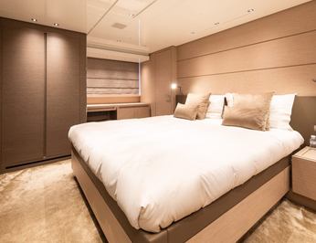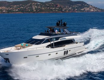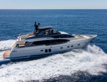 This Luxurious Sanlorenzo measuring 25m is a Private Motor Yacht available for Charter on the French Riviera. Its unique interior creates a spacious and modern look with its beautiful large windows that allow you to take in the stunning sea views of the Mediterranean. This Opulent Motor Yacht features 4 cabins, a living area, kitchen, and a large sundeck outdoor space equipped with sun loungers.