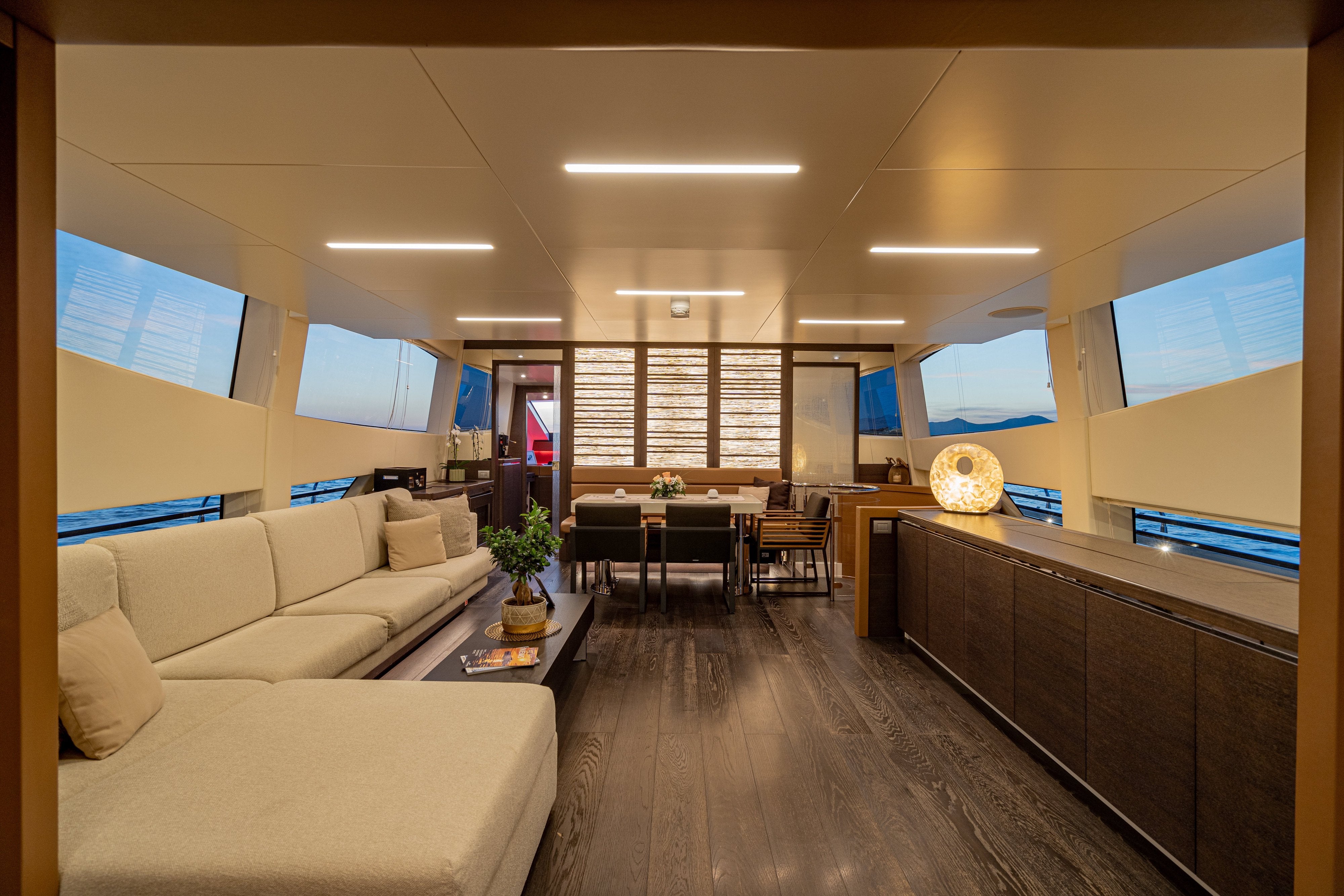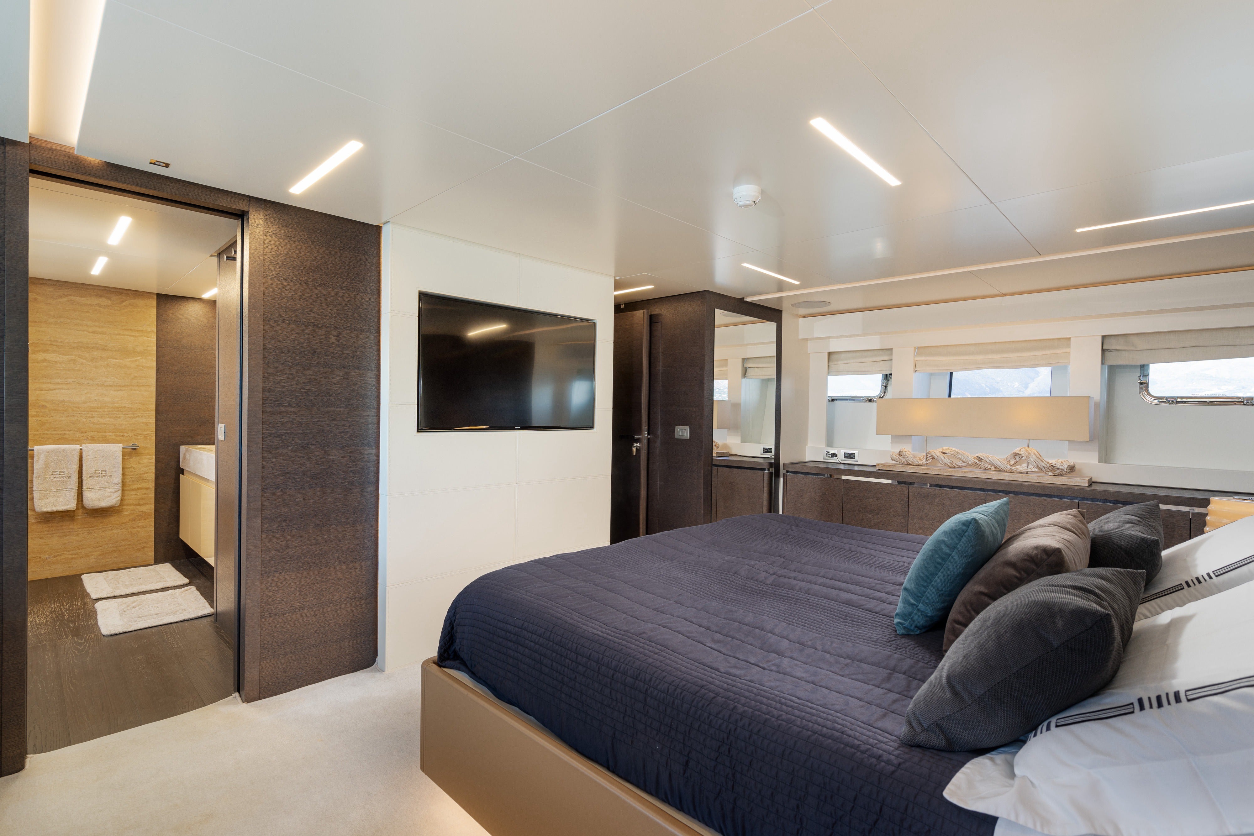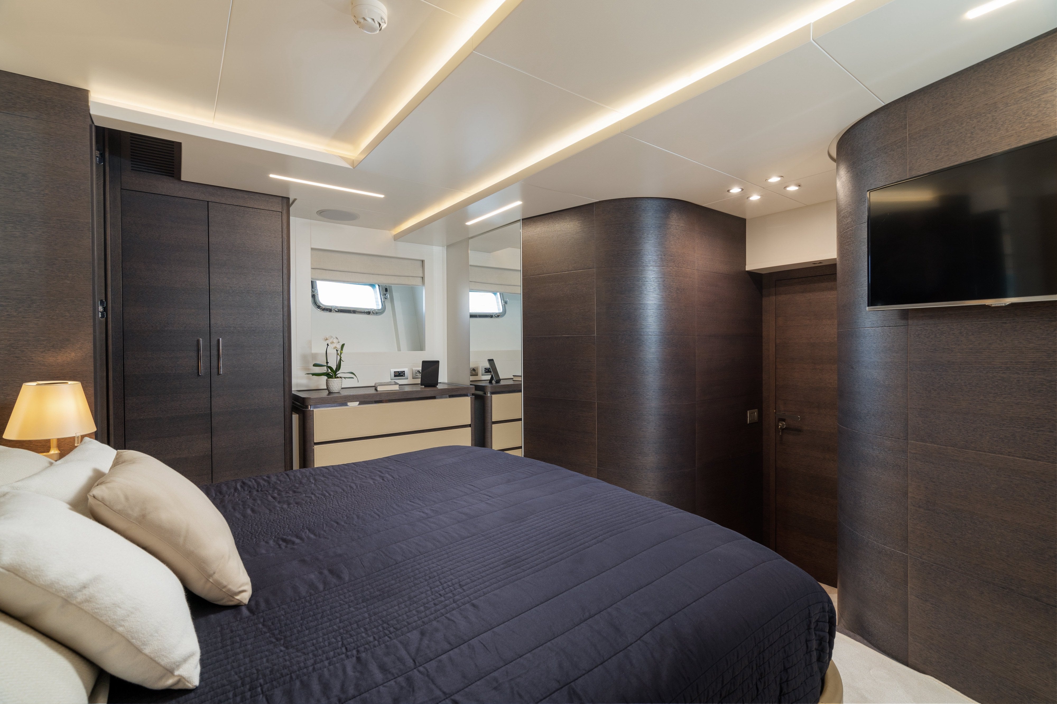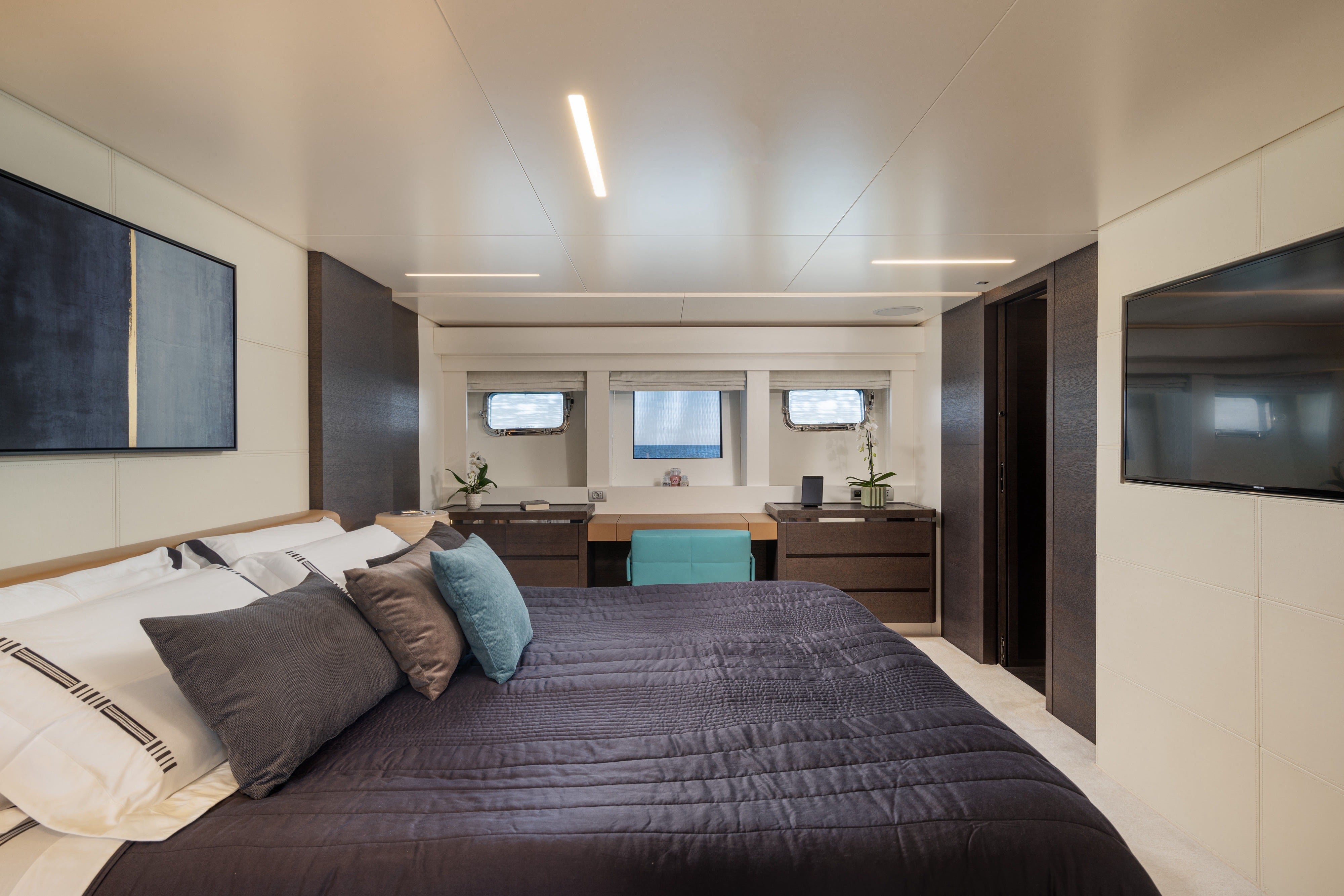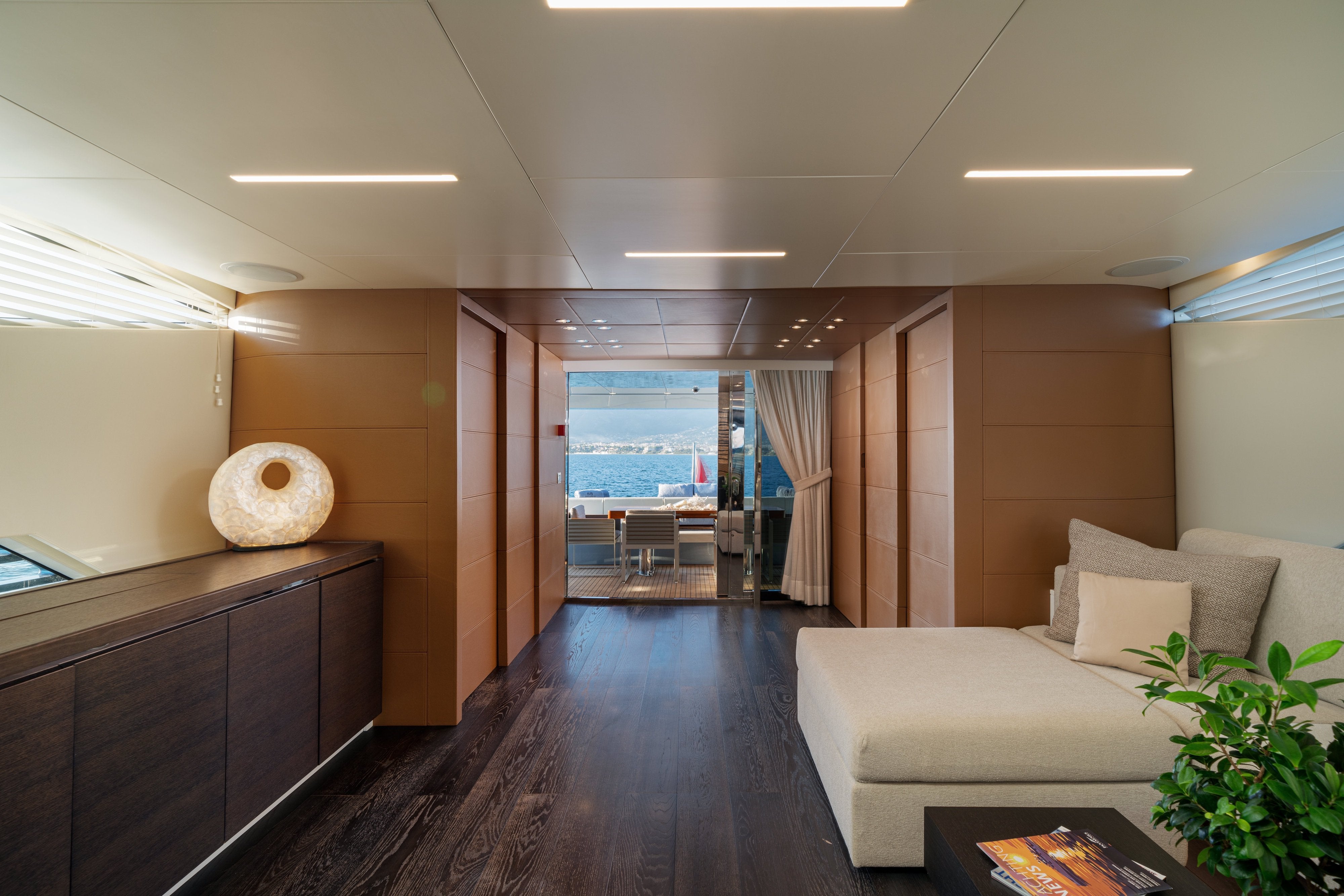 This Opulent Vessel features Stunning Italian design with a contemporary and cozy interior, large floor to Ceiling windows throughout the yacht that reveal the Stunning Picturesque Sea Views that brighten the interior space. Featuring 4 Spacious Suites, an open living area, kitchen, a large sundeck, & plenty of outdoor space with a sundeck and exterior bar, this Superyacht makes for a luxurious Yacht Charter Holiday in the Mediterranean.