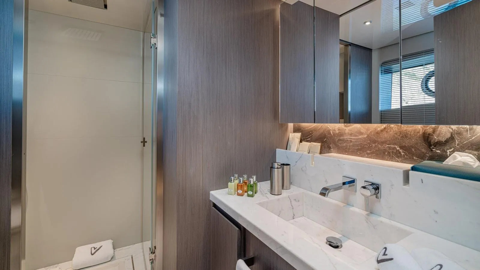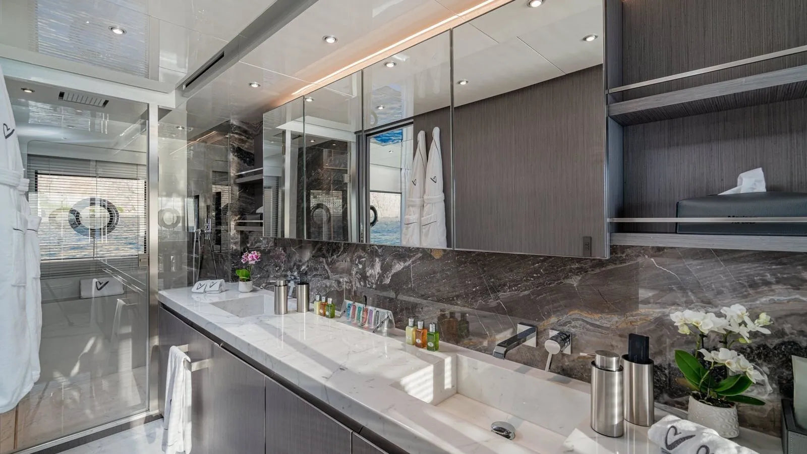 Outdoor living is exceptional aboard MARICAN FOREVER. The stern lounge offers a cozy space for relaxing by the sea, while the spacious flybridge provides a large dining area for 12 guests—perfect for al fresco meals during your Mediterranean yacht charter. Forward, the bow transforms into a private sanctuary with panoramic views, sheltered side windows, and a sleek hardtop with skylights, creating one of the yacht’s most exclusive leisure areas.