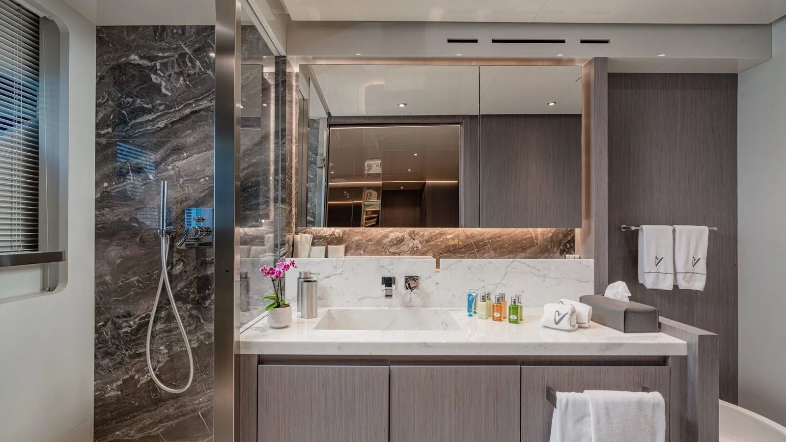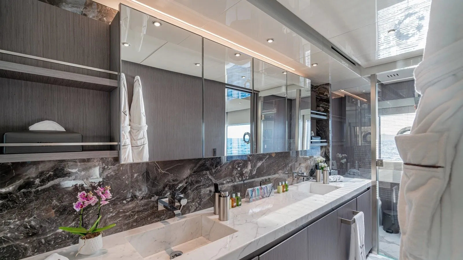 Accommodating up to 10 guests, she features a beautifully appointed Master suite on the main deck, along with two VIP cabins and two Twin cabins on the lower deck—ideal for families or groups seeking a luxurious yacht rental on the Amalfi Coast. Every cabin is designed to embrace sunlight and comfort, ensuring a peaceful retreat throughout your journey.