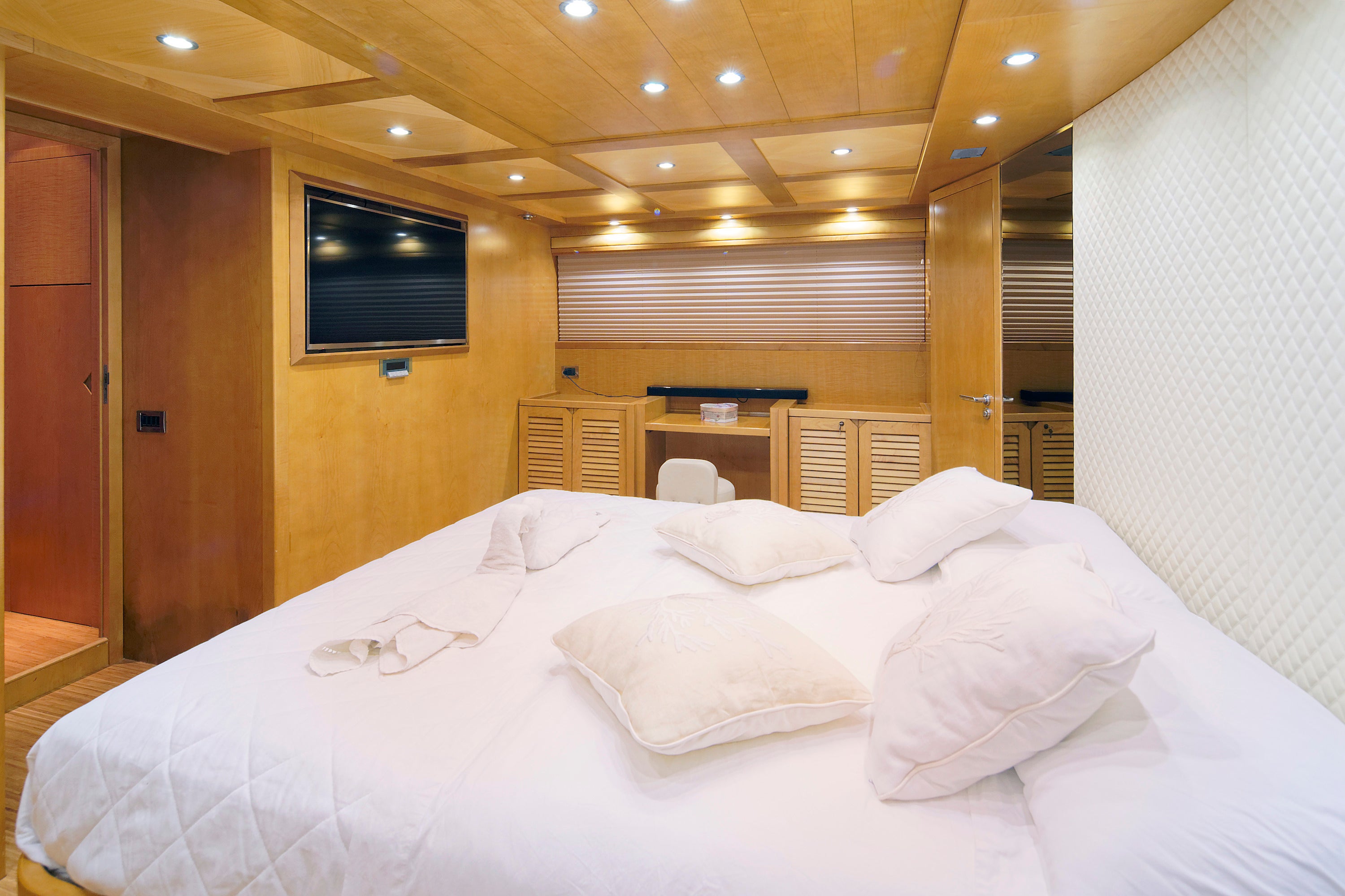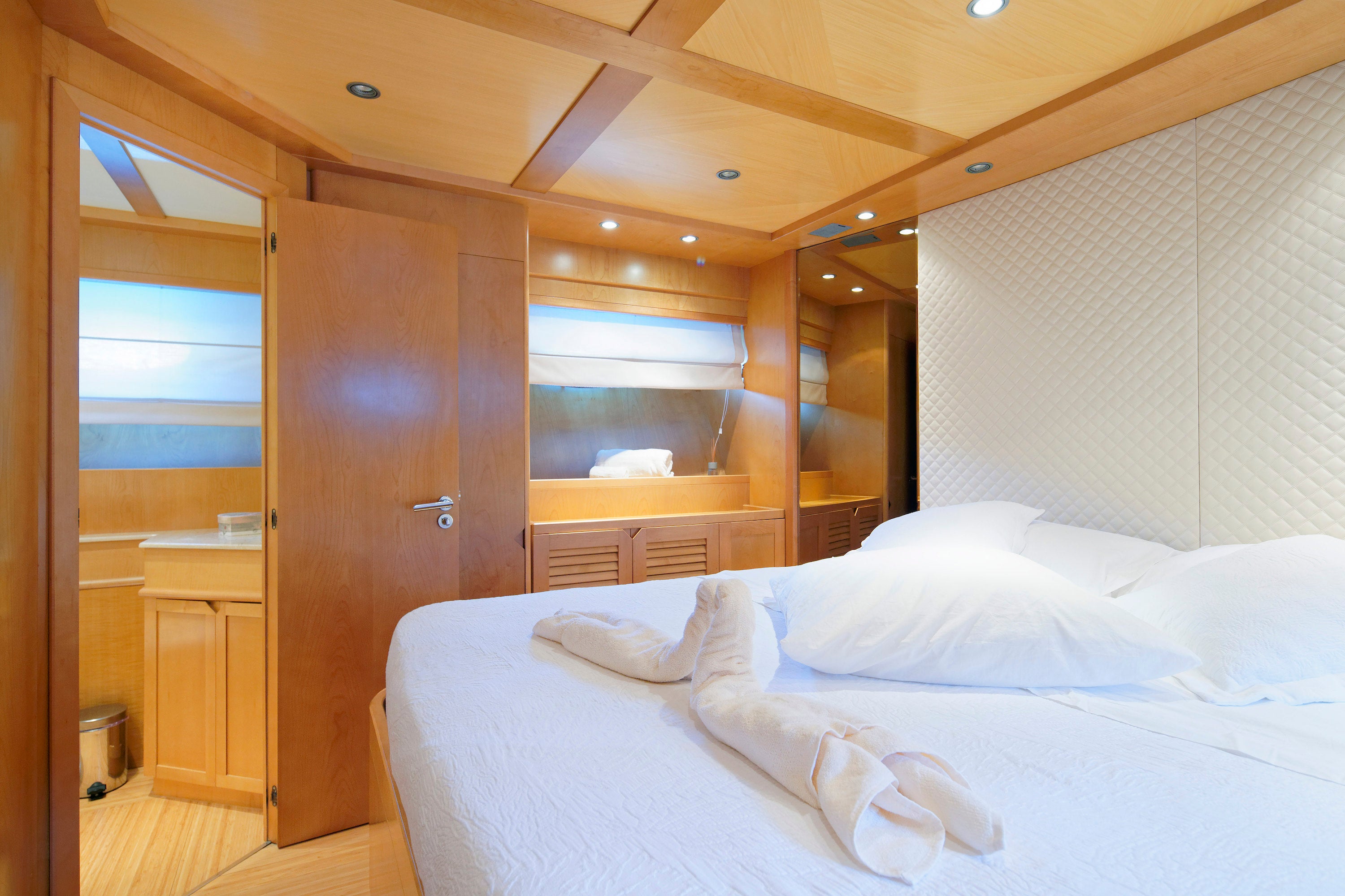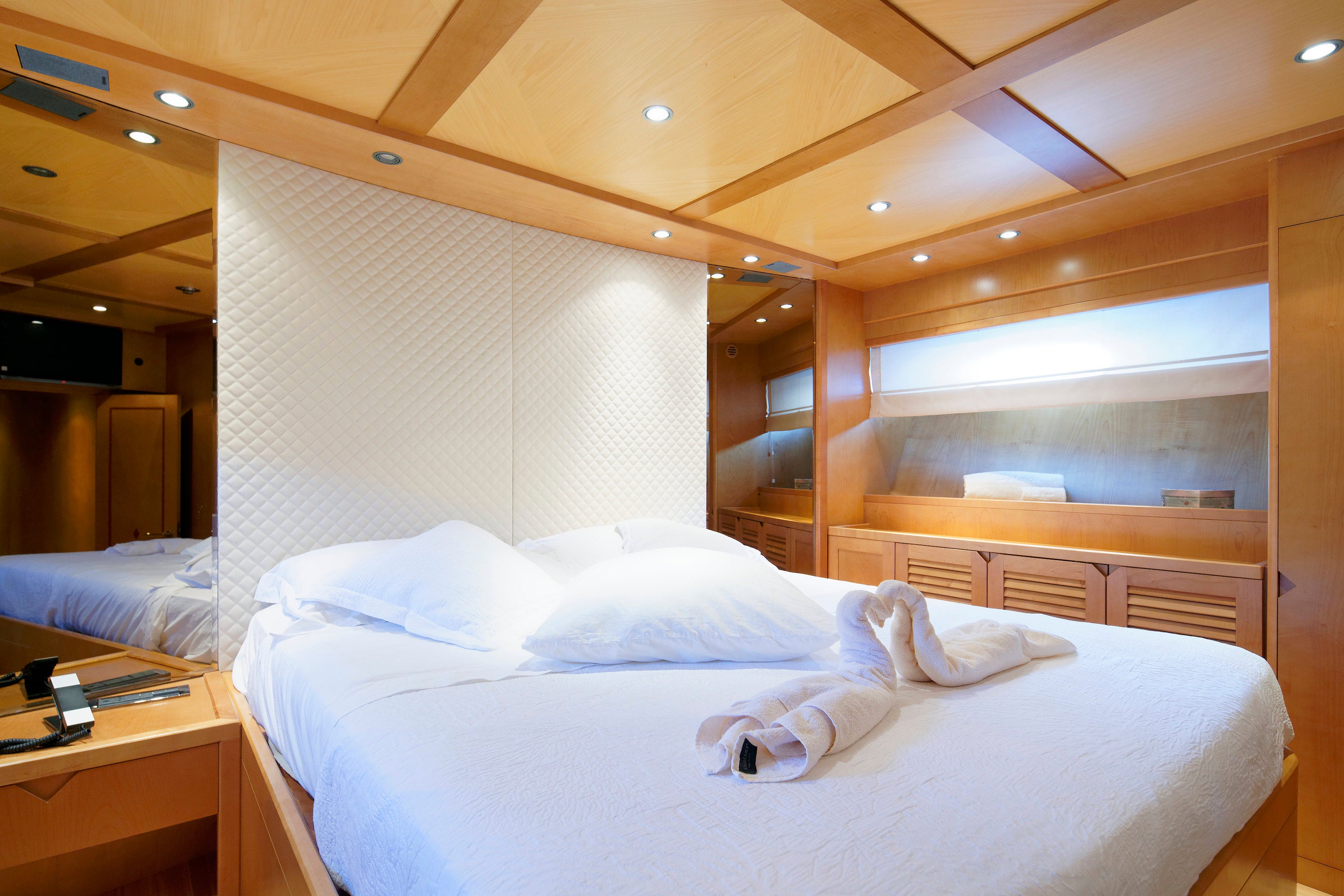 This Opulent Vessel features Stunning Italian design with a contemporary and cozy interior, large floor to Ceiling windows throughout the yacht that reveal the Stunning Picturesque Sea Views that brighten the interior space. Featuring 4 Spacious Suites (1 Master, 1 VIP, 1 Double, 1 Twin) , an open living area, kitchen, a large sundeck, & plenty of outdoor space with a sundeck and exterior bar, this Superyacht makes for a luxurious Yacht Charter Holiday in the Mediterranean.