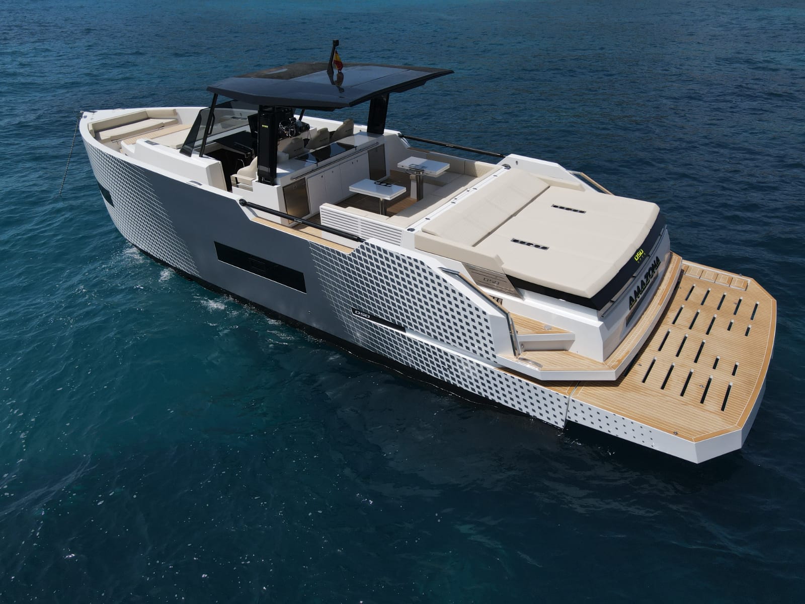 AMAZONA D50 is a Luxurious Yacht available for Rent in Ibiza. The sleek and sophisticated design is the perfect combination of Luxury and sport. This Motor boat features 1 large cabin, 1 bathroom, and a convertable living room.